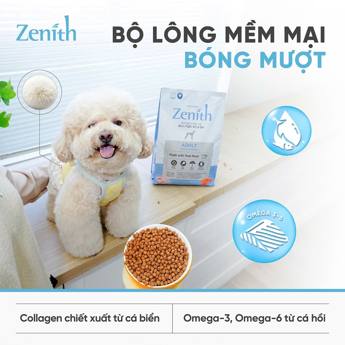 Zenith Adult Chicken & Salmon bổ sung đầy đủ vitamin A, D3, E, nhóm B (B1, B2, B6, B12) cùng các vi khoáng thiết yếu như Đồng, Sắt, Mangan. Hệ dưỡng chất này hỗ trợ hệ miễn dịch, nuôi dưỡng da và lông khỏe mạnh, củng cố xương khớp chắc chắn, đồng thời giúp chó trưởng thành duy trì năng lượng và thể trạng cân bằng mỗi ngày.