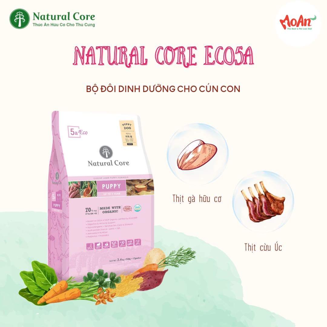 Thức ăn hữu cơ cho chó con Natural Core thịt cừu được chế biến từ các loại thịt tươi và các nguyên liệu được chứng nhận hữu cơ ECOCERT: thịt cừu Úc và thịt nạc gà hữu cơ, khoai lang hữu cơ và ngũ cốc. Với nhiều chất dinh dưỡng tốt cho sức khỏe thú cưng, ECO5a có tác dụng nổi bật trong việc hỗ trợ sự phát triển của chó con.