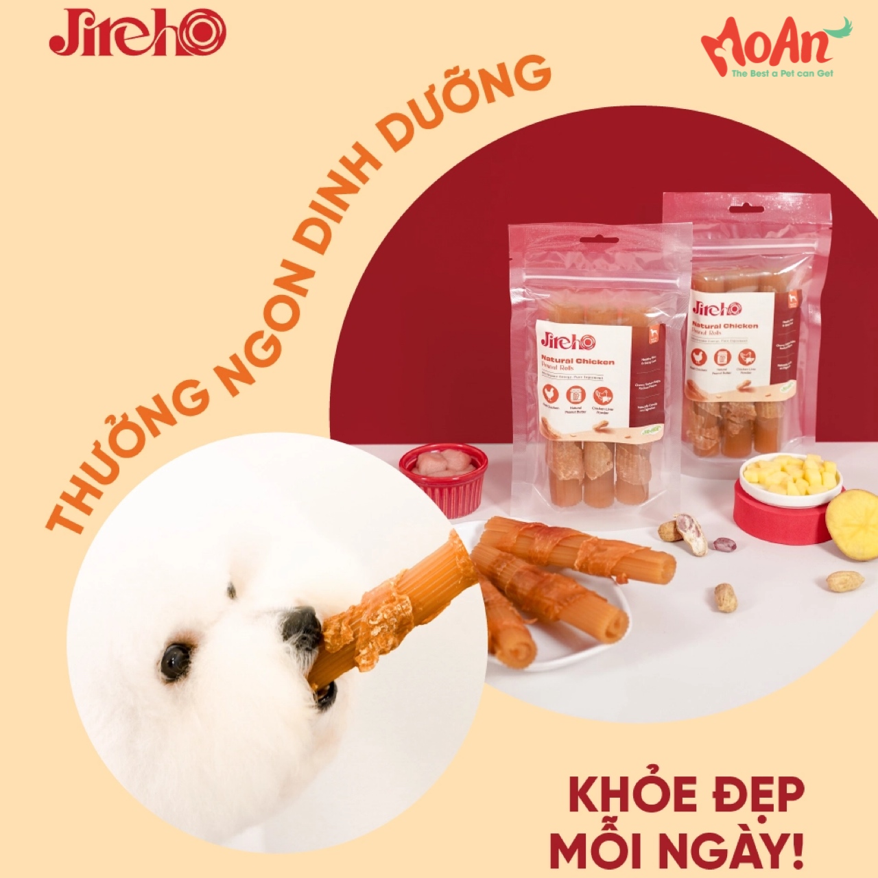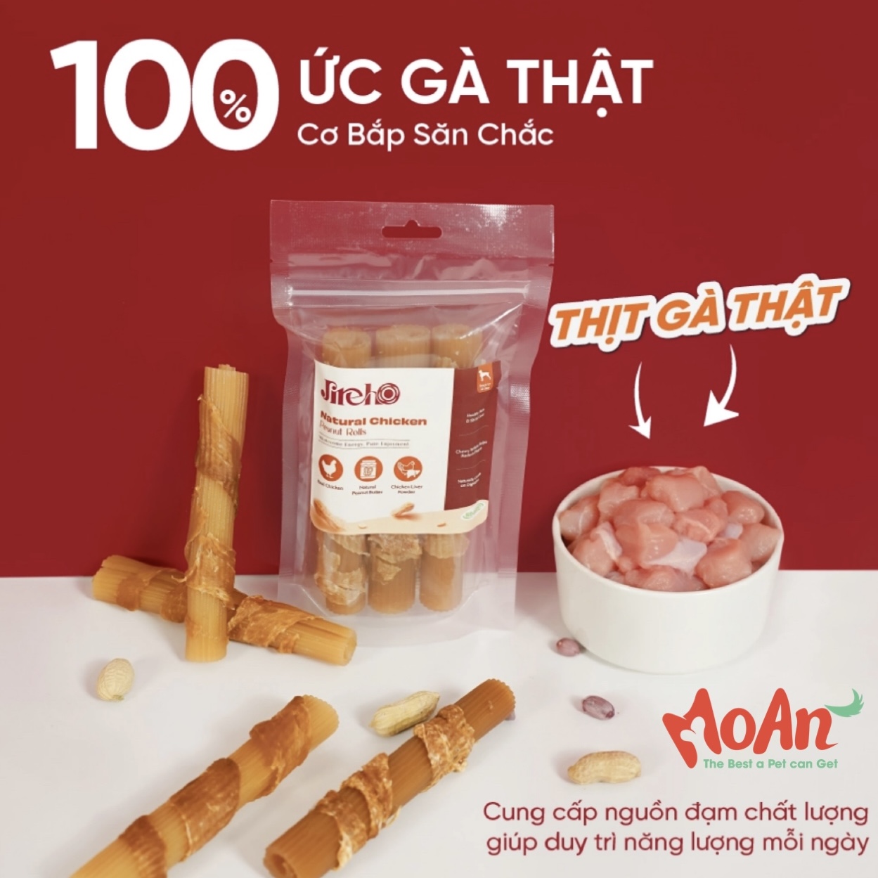 Tận hưởng hương vị tự nhiên và thuần khiết trong từng que cuộn Gà & Đậu phộng cho chó JirehO - sự kết hợp hoàn hảo giữa thịt gà thật nguyên chất, bơ đậu phộng thơm béo và gan gà, mang đến hương vị hấp dẫn cùng nguồn năng lượng dinh dưỡng cho các bé mỗi ngày.