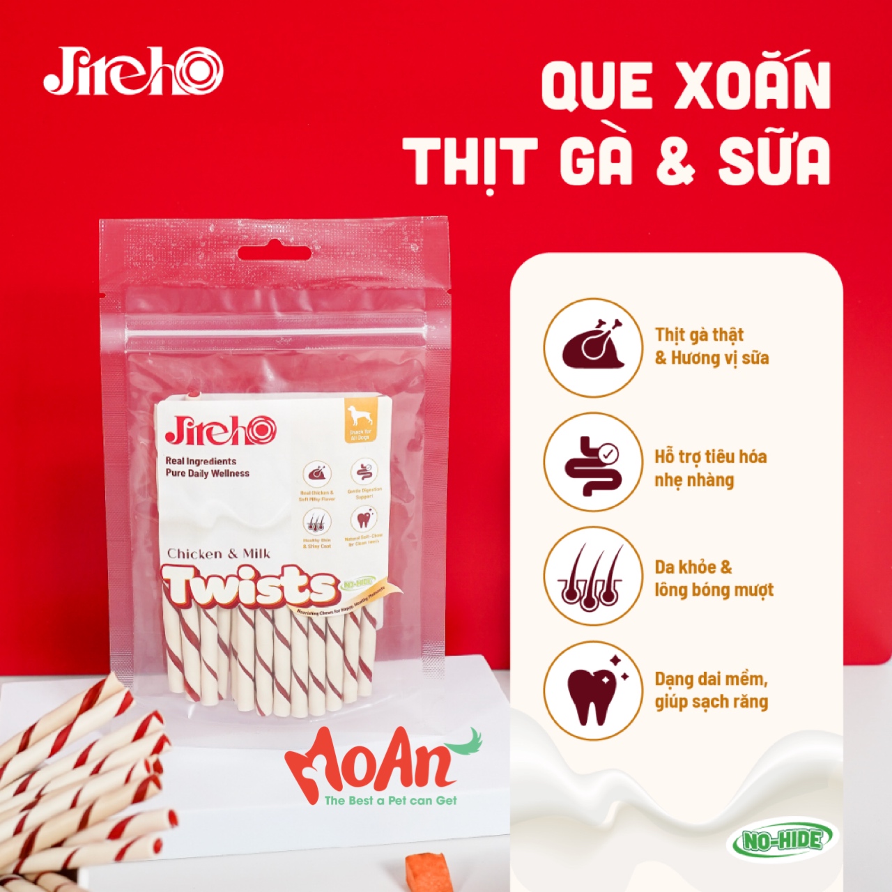 Que xoắn Thịt gà & Sữa JirehO cho chó là snack nhai thơm béo từ ức gà thật, sữa và rau củ tự nhiên, mang đến hương vị thơm ngon mà mọi cún cưng đều không thể cưỡng lại. Với công thức cân bằng giữa đạm dễ tiêu, chất xơ tự nhiên và vitamin thiết yếu, phù hợp sử dụng hằng ngày như phần thưởng hoặc món ăn vặt an toàn cho Boss.