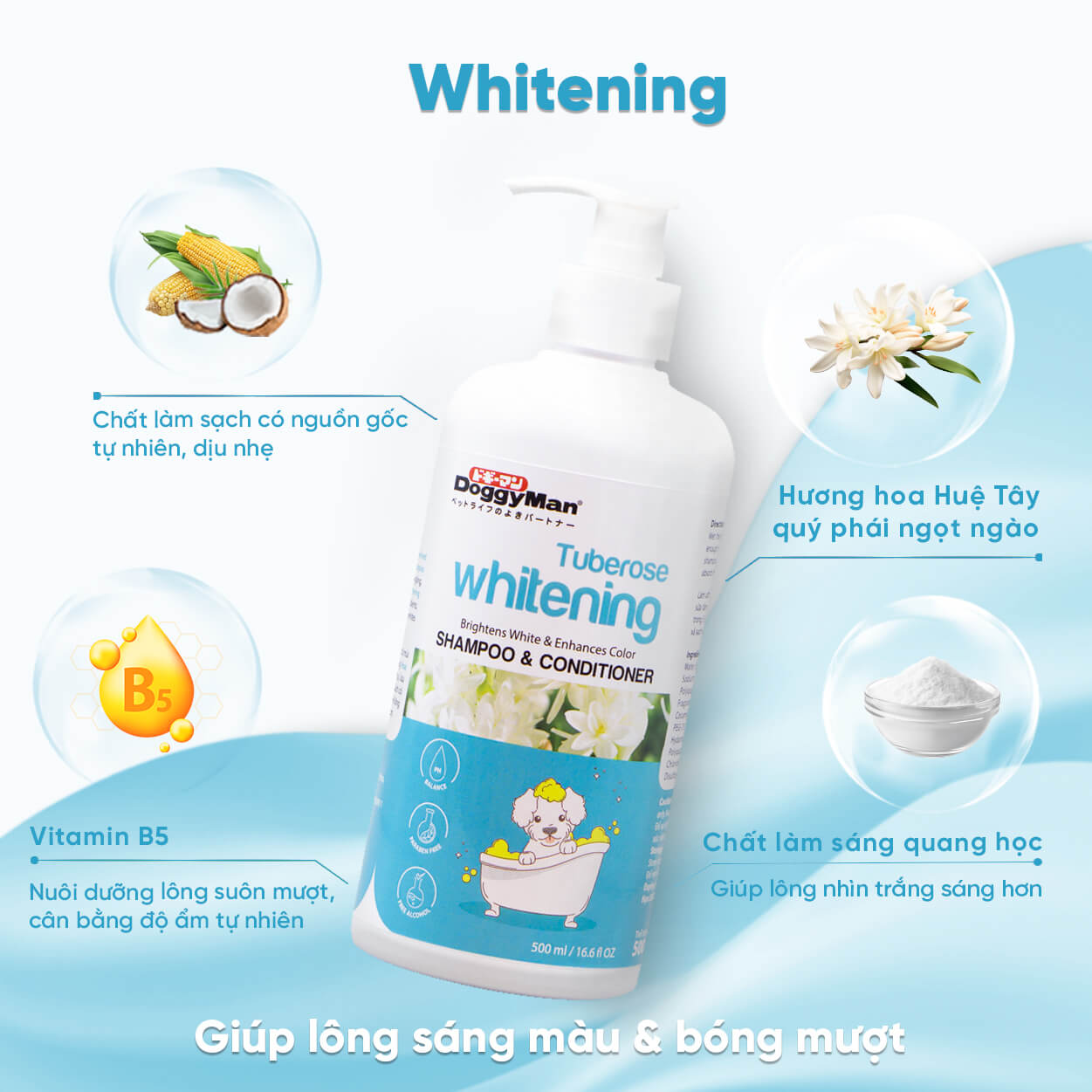 Sữa tắm DoggyMan Whitening có tác dụng làm sạch, khử mùi hôi, dưỡng lông và cấp ẩm cho làn da thú cưng. Hương Hoa Huệ Tây quý phái ngọt ngào đem lại cảm giác dễ chịu, lưu hương dài lâu. Công thức sử dụng các thành phần làm sạch có nguồn gốc tự nhiên, dịu nhẹ. Vừa cấp ẩm cho da, hạn chế lông xơ rối, gãy rụng, vừa giúp bộ lông trắng sáng và óng ả hơn.
