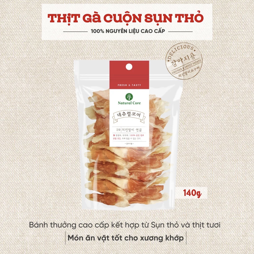 Thịt gà cuộn sụn thỏ là món bánh thưởng cao cấp được làm từ 100% thành phần tự nhiên: thịt gà và sụn thỏ, giúp bổ sung Protein và phát triển da lông.