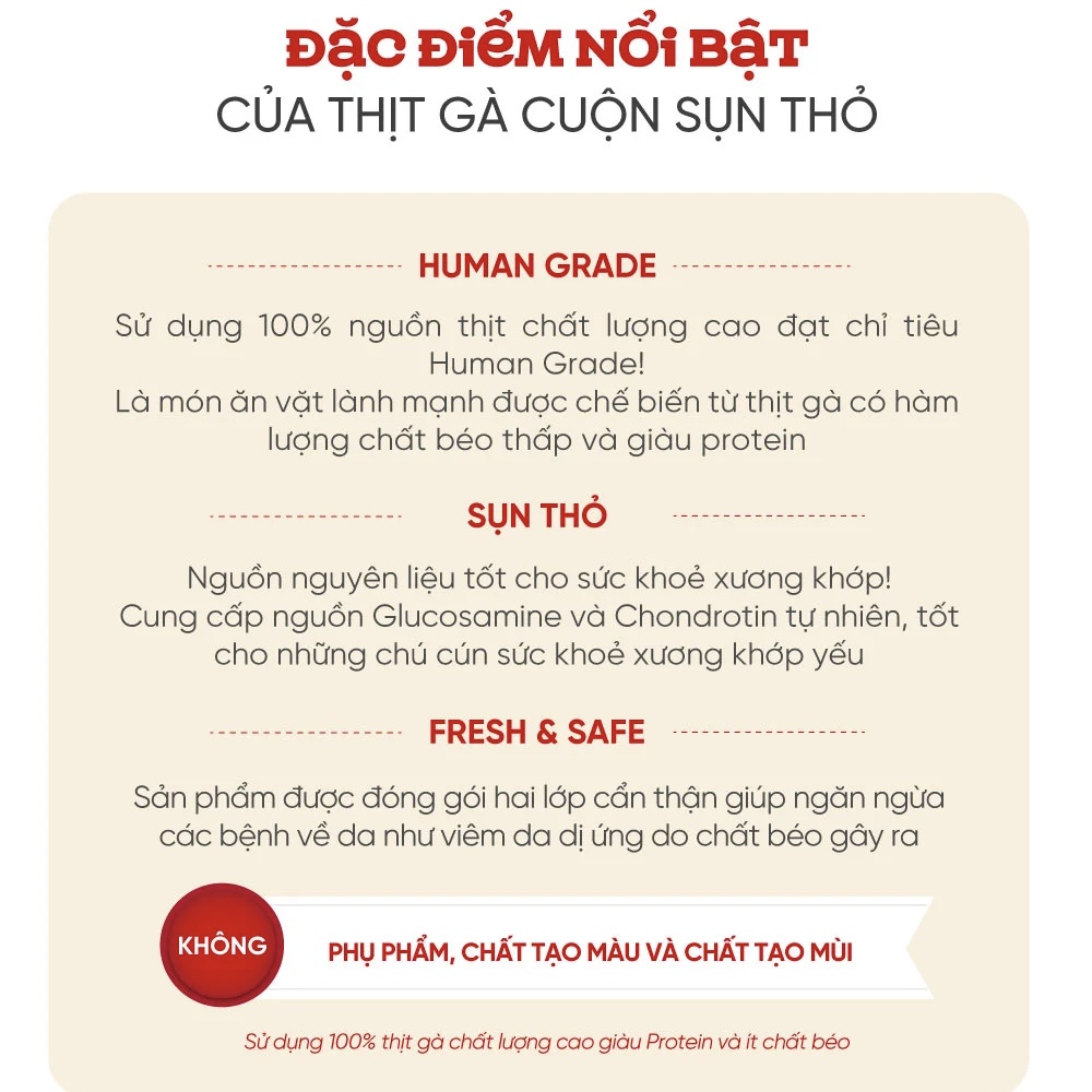 Thành phần: Thịt gà, thịt tai thỏ, Glycerin (dầu dừa)