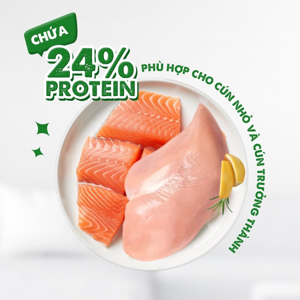 - Chứa 24% protein phù hợp với chó nhỏ và chó trưởng thành