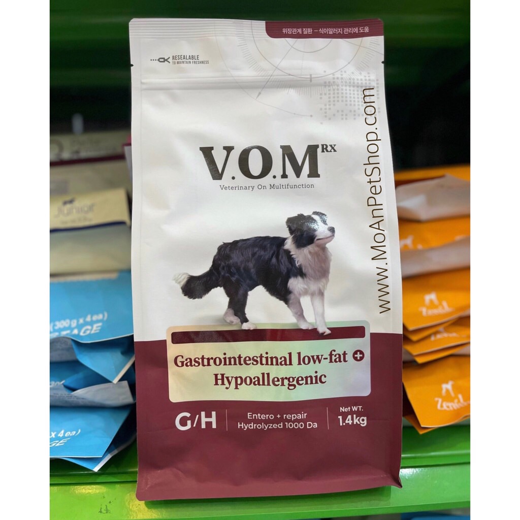 V.O.M RX Gastrointestina Low-Fat + Hypoallergenic làthức ăn hạt dinh dưỡng hỗ trợ trị liệu cho hệ tiêu hóa và chống dị ứng thực phẩm ở chó, có công dụng: