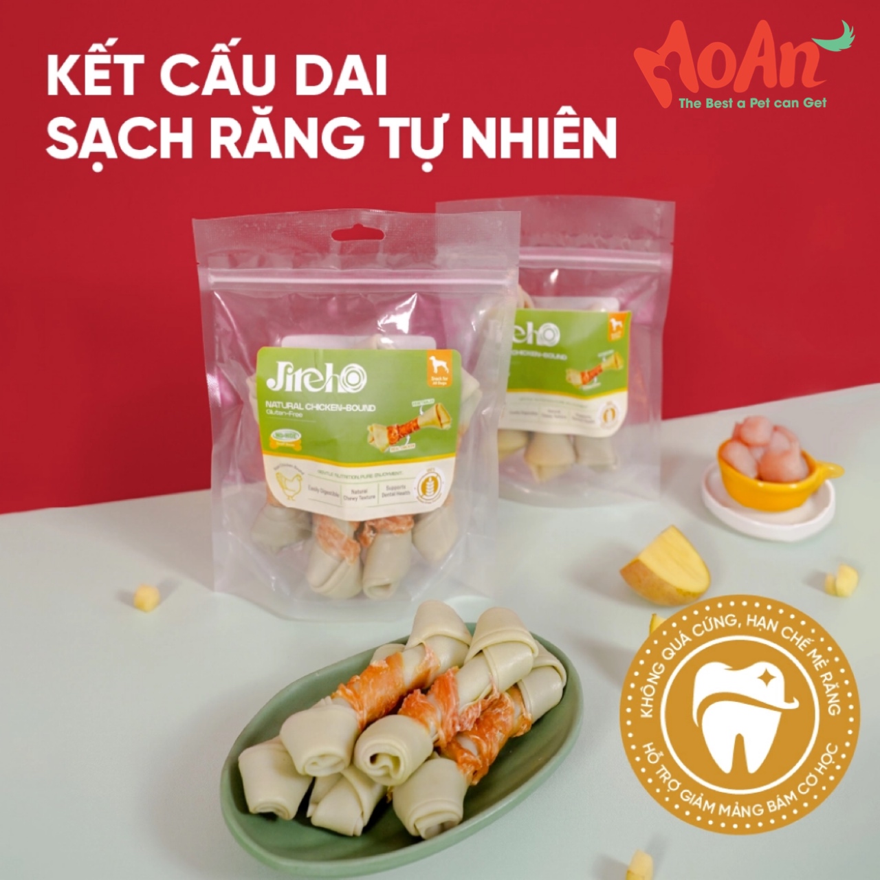 Snack có độ dẻo dai vừa phải, giúp bé nhai lâu hơn, từ đó hỗ trợ giảm mảng bám trên răng thông qua cơ chế làm sạch cơ học. Kết cấu không quá cứng giúp hạn chế nguy cơ mẻ răng, phù hợp với nhiều giống chó khác nhau.